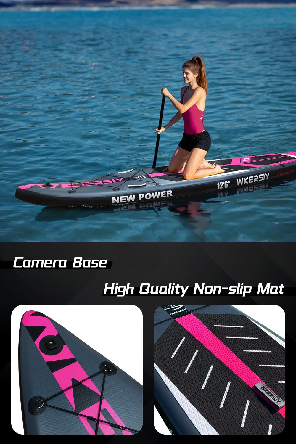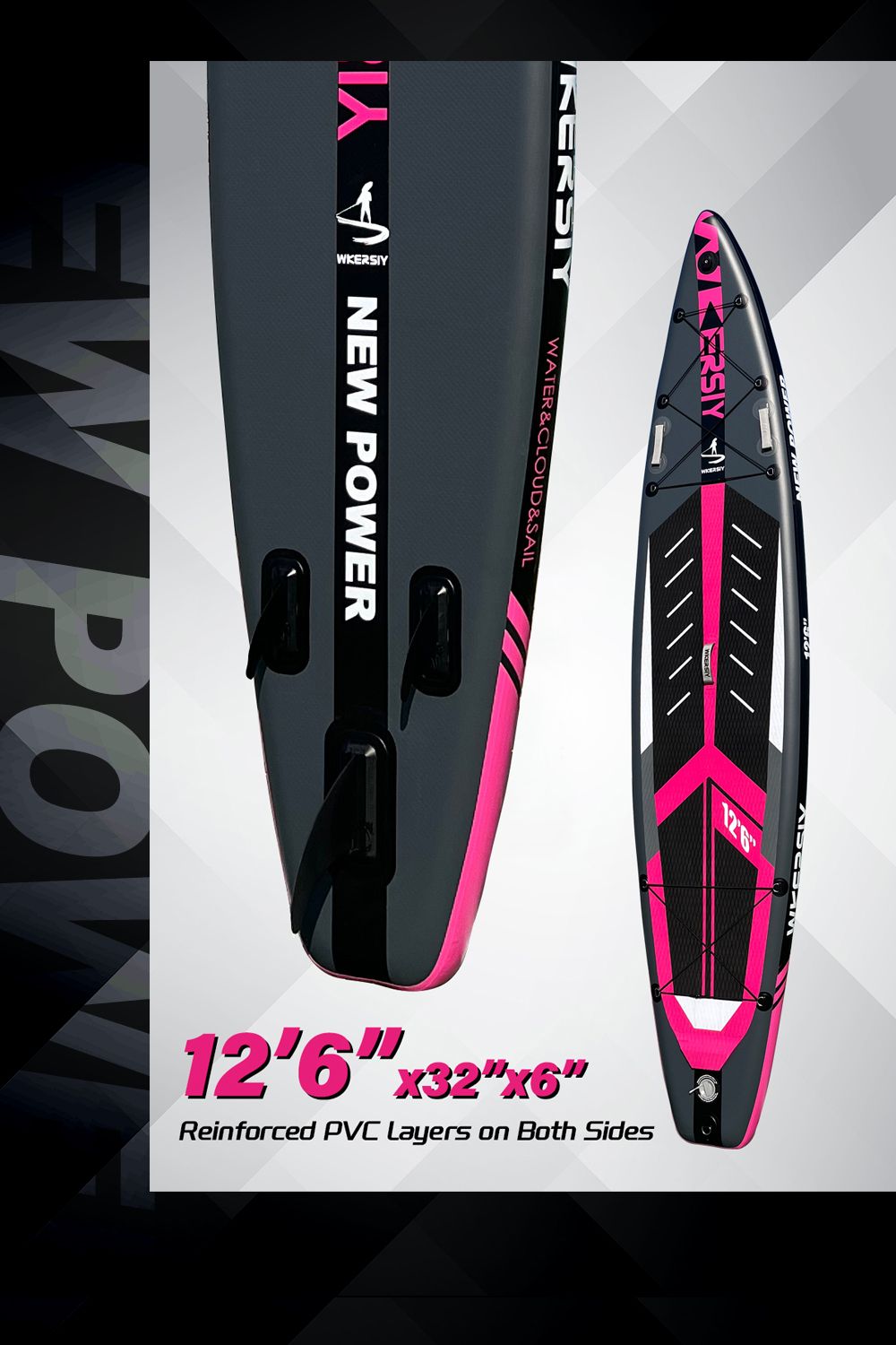 WERSIY Racing Series (available in "Vital Leaf Green" and "Blossom Aura Pink" styles) is a professional competitive SUP, with "ultra-narrow board + high-modulus material" as the core to pursue extreme speed. The series adopts a 71cm ultra-narrow width (the narrowest in the entire product line) + 400cm length, paired with a pointed bow design to minimize water resistance, suitable for high-speed needs in competitions; made of 1.2mm high-modulus drop-stitch PVC (with carbon fiber reinforcement), it can reach 20PSI inflation hardness (equivalent to hard racing boards) to ensure excellent rigidity and gliding efficiency, with a single board only 8kg for easy competition transportation. The board deck is streamlined for performance: only the standing area is equipped with a non-slip pad, integrated fixed foot straps (adapting to optimal paddling posture), and a low-profile design to reduce wind resistance; a single large center fin (removable) maximizes tracking accuracy, enabling precise control during high-speed turns. Accessories include a full carbon fiber racing paddle (fixed 2.6m length, optimized for power transfer), a high-pressure electric air pump (inflating to 20PSI in 8 minutes), a quick-release low-drag racing leash, and a lightweight racing bag (for fast board deployment). It’s suitable for scenarios like professional SUP competitions, high-intensity speed training, and extreme water gliding—a professional racing gear that pushes the limits of speed and performance.