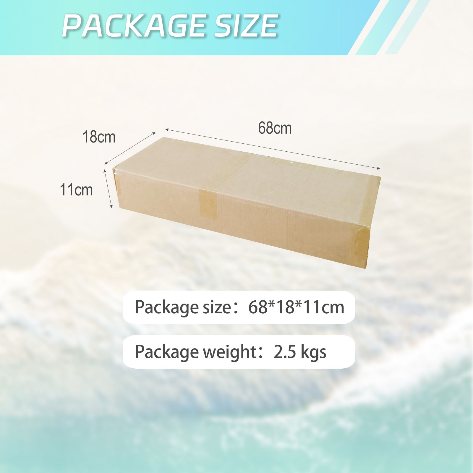 Specs: 105×60×10cm (100kg capacity); accessories: valve adapter, leash, carry bag; packaging: 68×18×11cm (2.5kg).