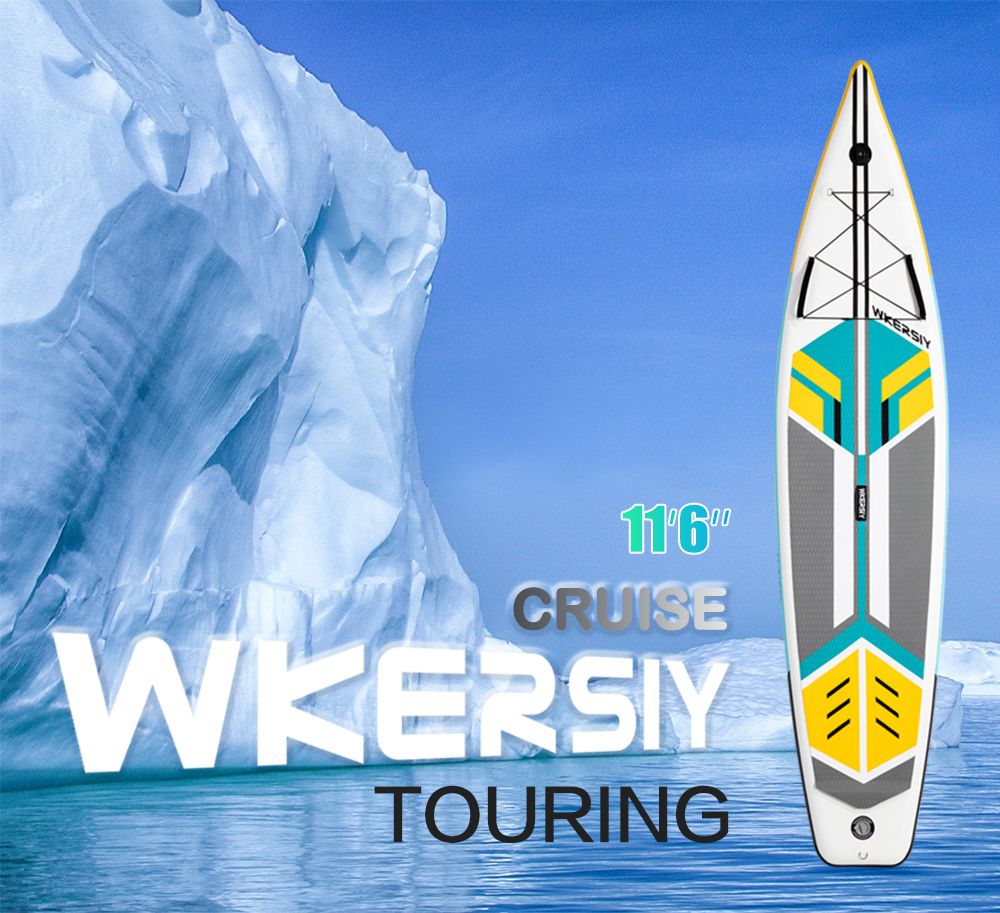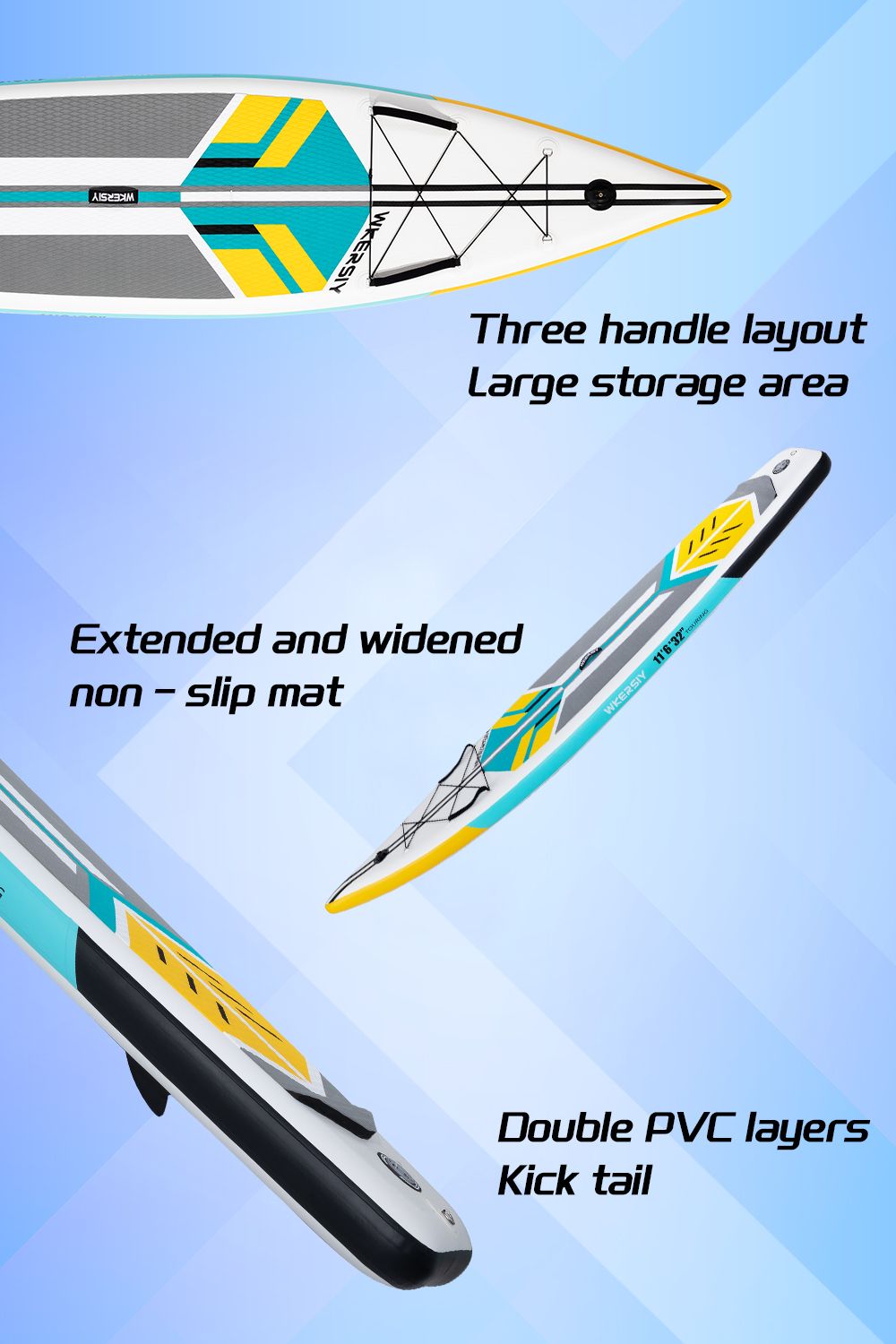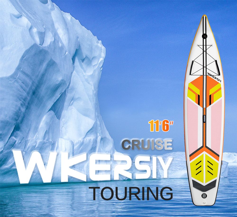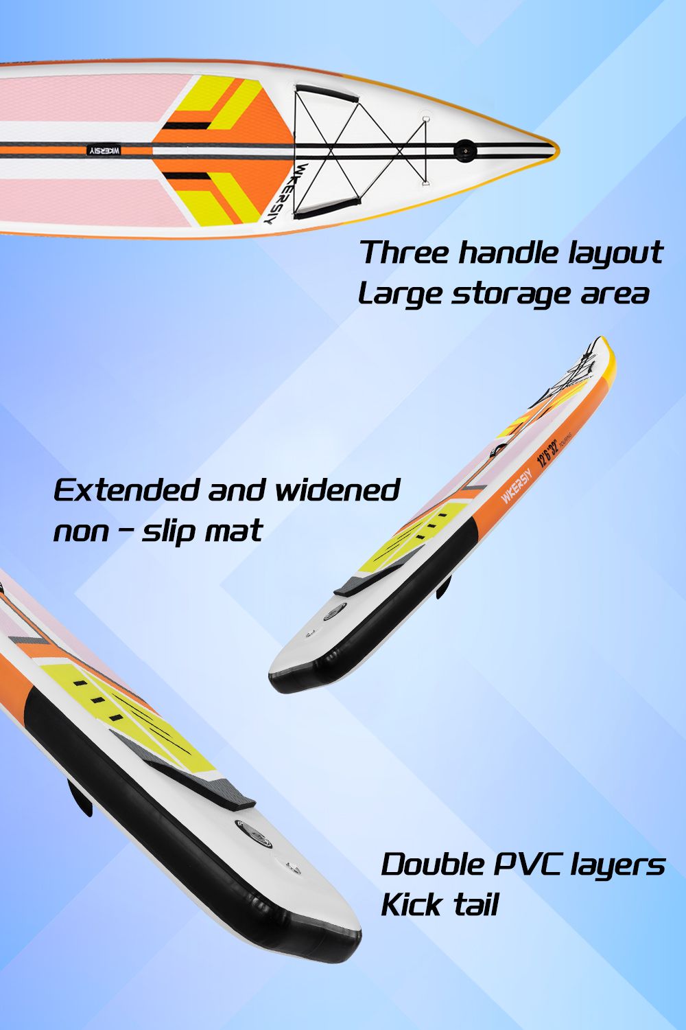 WERSIY Cruising Series (including “Aqua-Shade Blue 380”, “Emerald Veil Green 350”and“Sun-Aura Orange 350”models) is a professional-grade long-distance navigation gear, with "aerodynamic shape + high rigidity" as the core to meet advanced needs. The series adopts a streamlined narrow design (78cm width, up to 395cm length) to reduce water resistance, suitable for maintaining speed during long-distance navigation; made of 1.1mm ultra-thick drop-stitch PVC (with reinforced side rails), it can reach 18PSI inflation hardness (close to hard boards) to ensure excellent gliding performance, with a maximum load of 140kg. The board deck is optimized for efficiency: the non-slip pad only covers the standing area (reducing weight), and optional integrated foot straps adapt to more aggressive paddling postures; the 3-fin setup (1 large center fin + 2 small side fins) improves tracking accuracy, maintaining straight gliding even in mild currents. Accessories include a full carbon fiber paddle (telescoping 2.3-2.6m, only 0.7kg ultra-light), a high-pressure air pump (inflating to 18PSI in 10 minutes), a reinforced leash (safety guarantee for long distances) and a hard-shell storage case (protecting the board during transportation). It’s suitable for scenarios like advanced SUP cruising, cross-water expeditions, and performance-oriented water activities—a professional cruising gear balancing speed, durability and precision.