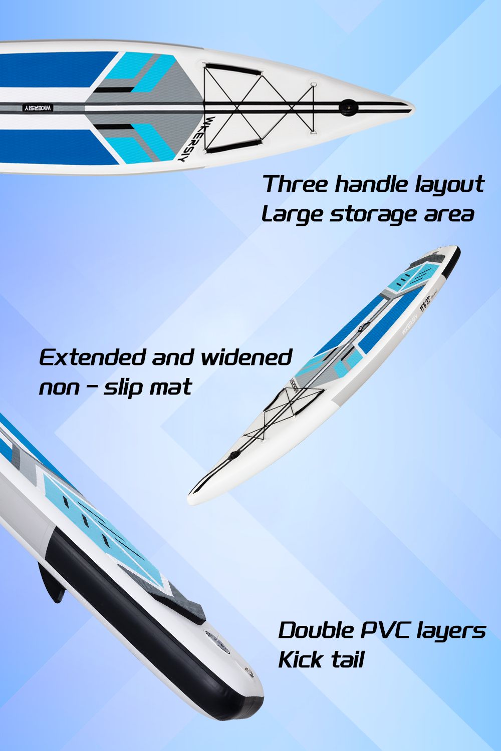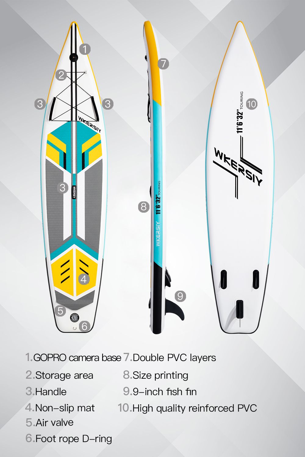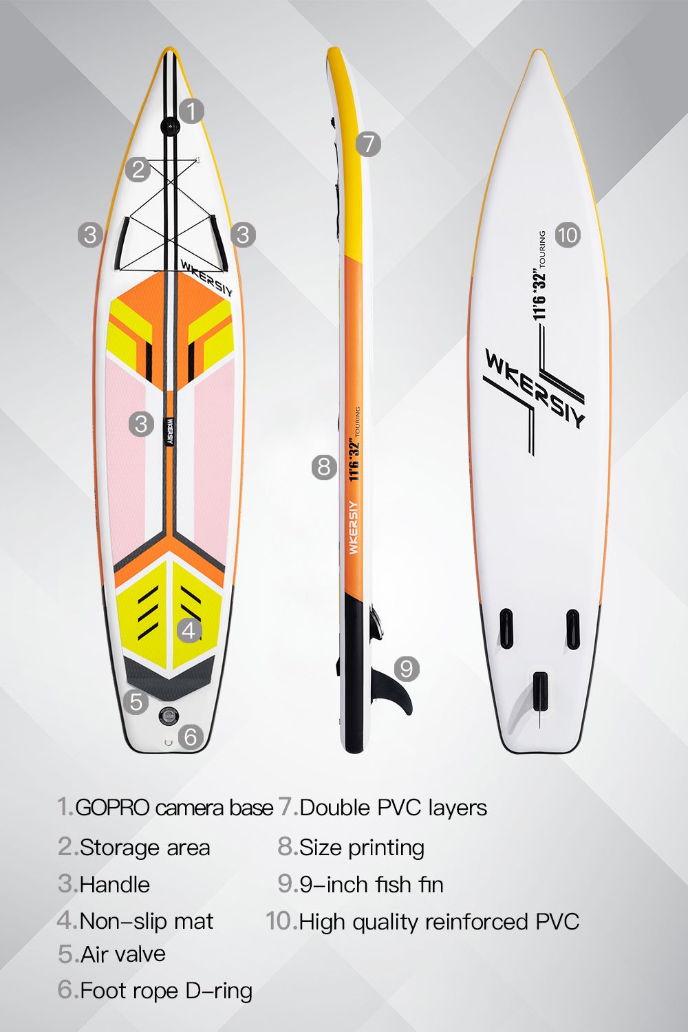 WERSIY Cruising Series (including “Aqua-Shade Blue 380”, “Emerald Veil Green 350”and“Sun-Aura Orange 350”models) is a professional-grade long-distance navigation gear, with "aerodynamic shape + high rigidity" as the core to meet advanced needs. The series adopts a streamlined narrow design (78cm width, up to 395cm length) to reduce water resistance, suitable for maintaining speed during long-distance navigation; made of 1.1mm ultra-thick drop-stitch PVC (with reinforced side rails), it can reach 18PSI inflation hardness (close to hard boards) to ensure excellent gliding performance, with a maximum load of 140kg. The board deck is optimized for efficiency: the non-slip pad only covers the standing area (reducing weight), and optional integrated foot straps adapt to more aggressive paddling postures; the 3-fin setup (1 large center fin + 2 small side fins) improves tracking accuracy, maintaining straight gliding even in mild currents. Accessories include a full carbon fiber paddle (telescoping 2.3-2.6m, only 0.7kg ultra-light), a high-pressure air pump (inflating to 18PSI in 10 minutes), a reinforced leash (safety guarantee for long distances) and a hard-shell storage case (protecting the board during transportation). It’s suitable for scenarios like advanced SUP cruising, cross-water expeditions, and performance-oriented water activities—a professional cruising gear balancing speed, durability and precision.